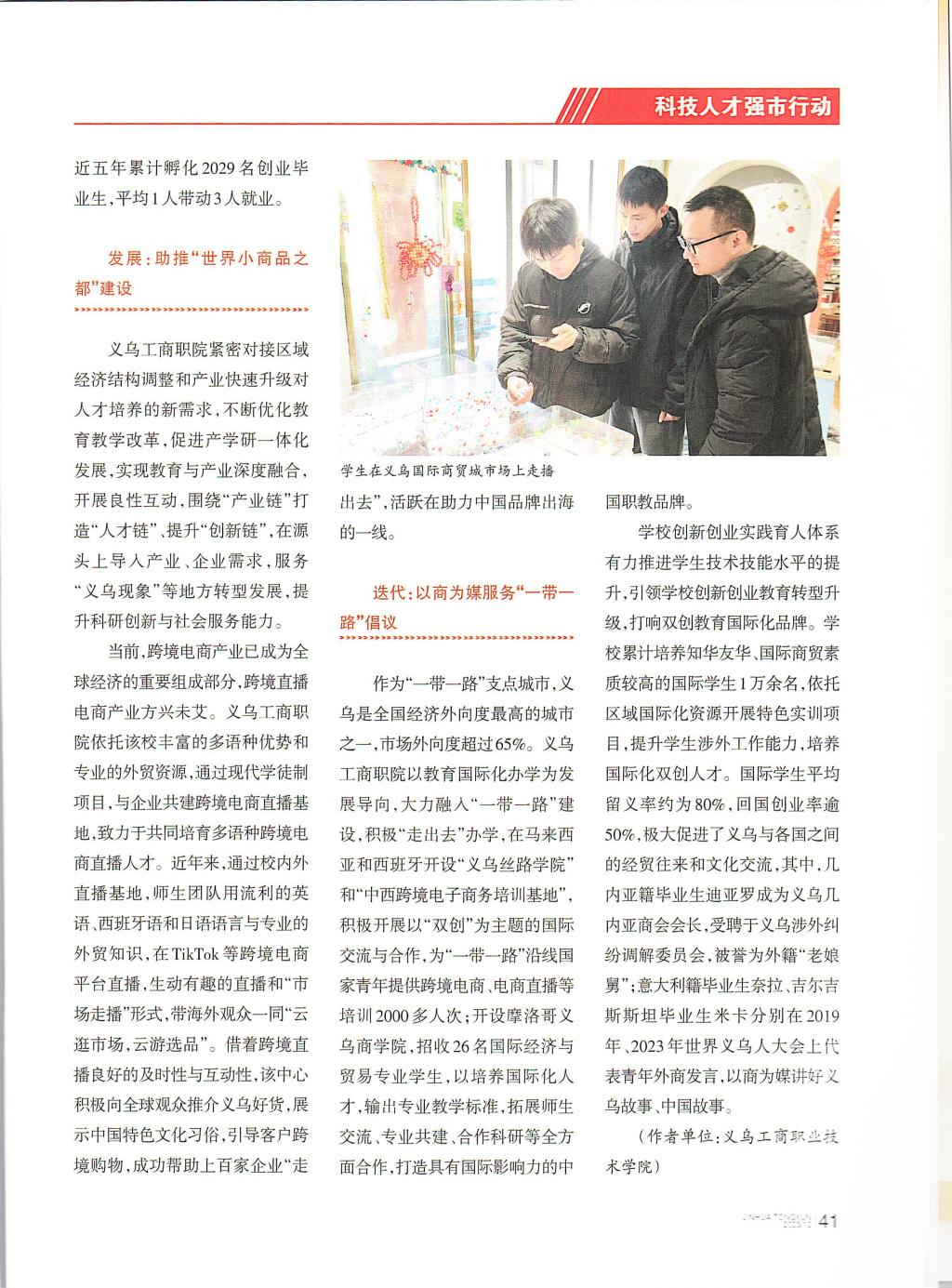 2020年,直播经济蔚然成风,义乌工商职院紧扣时代脉搏,与阿里巴巴1688共建全国首个“1688商+直播 校园直播基地”,与腾讯看点直播共建全国首个“腾讯看点校园直播基地”,牵头成立全国直播电商职业教育集团,吸引全国184所院校、24家龙头企业加入,并作为省内唯一高校入选浙江省直播电商基地。在紧跟市场、引领产业、影响行业的稳步前行中,义乌工商职院应届毕业生创业率稳定在12%左右,近五年累计孵化2029名创业毕业生,平均1人带动3人就业。