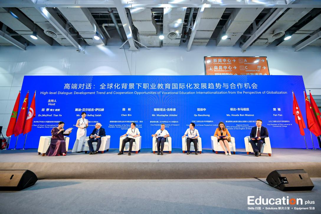 在高端对话环节,樊曜与突尼斯莫纳斯提尔大学校长黑迪·贝尔哈吉·萨拉赫,湖南铁路科技职业技术学院院长陈彬,摩洛哥哈桑二世卡萨布兰卡大学副校长穆斯塔法·克希德,河南工业职业技术学院副院长屈保中,摩洛哥职业教育与就业发展办公室区域主任侯达·本马祖兹就“全球化背景下职业教育的国际化发展趋势与合作机会”进行交流与分享。