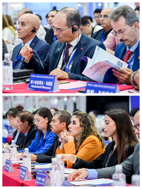 摩洛哥卡萨布兰卡教育局局长阿卜杜勒蒙·塔利布先生、摩洛哥教育部国际合作部主任娜迪娅·拉赫米里女士、摩洛哥职业教育与就业发展办公室区域主任阿卜杜拉欣·米夫达尔先生等近10位北非国家政府教育部门代表;摩洛哥蒙迪亚波利斯大学校长穆罕默德·巴尔卡维先生、突尼斯莫纳斯提尔大学校长黑迪·贝尔哈吉·萨拉赫先生、突尼斯中央大学工程学院院长伊迈德·马迪先生等近30位北非国家高校代表;中教国际教育交流中心主任张靖、沧州职业技术学院院长杨静利、湖南铁路科技职业技术学院院长陈彬等中国高校、机构近百位代表出席会议。
