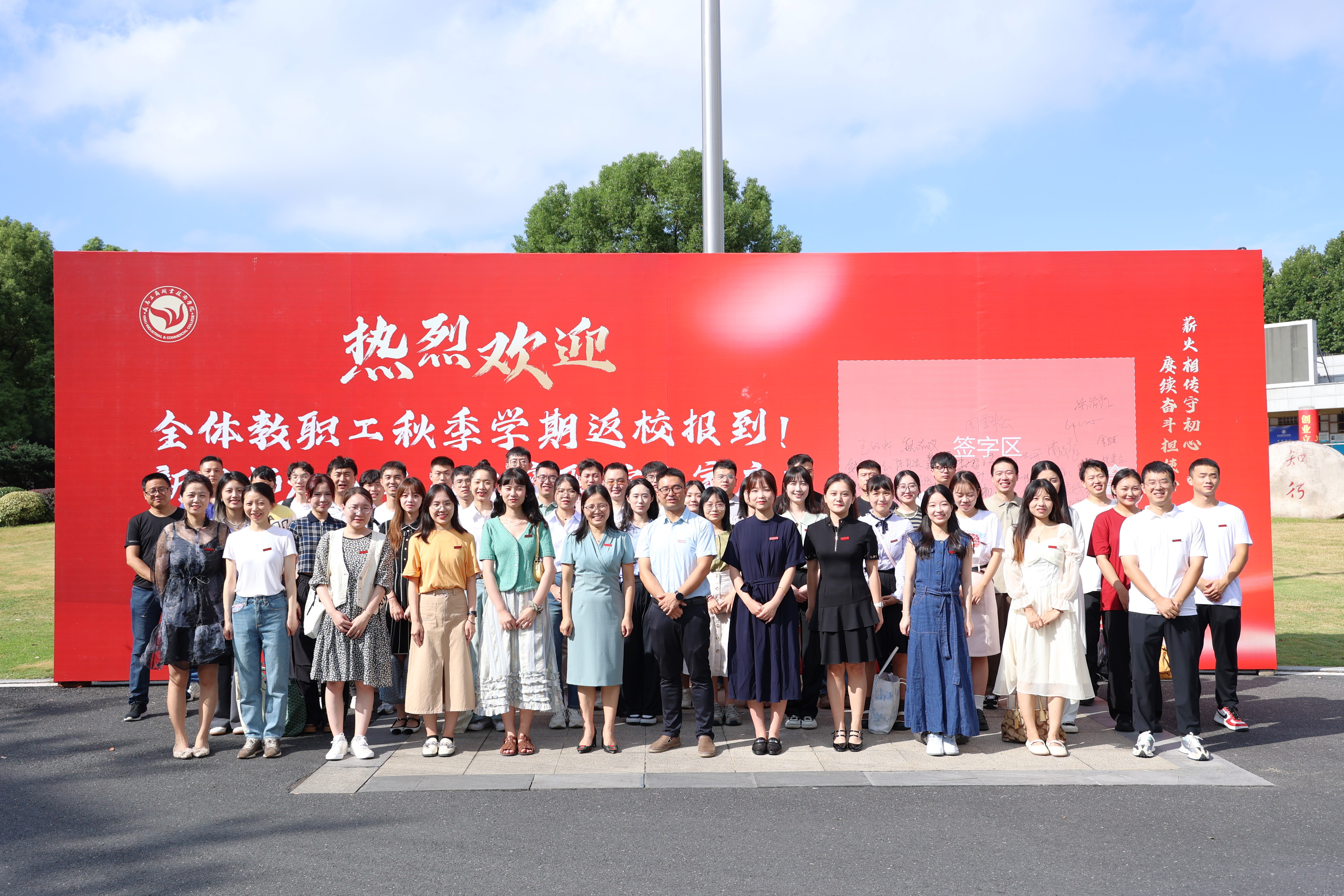 新进教职工在欢迎展板前签名拍照留念