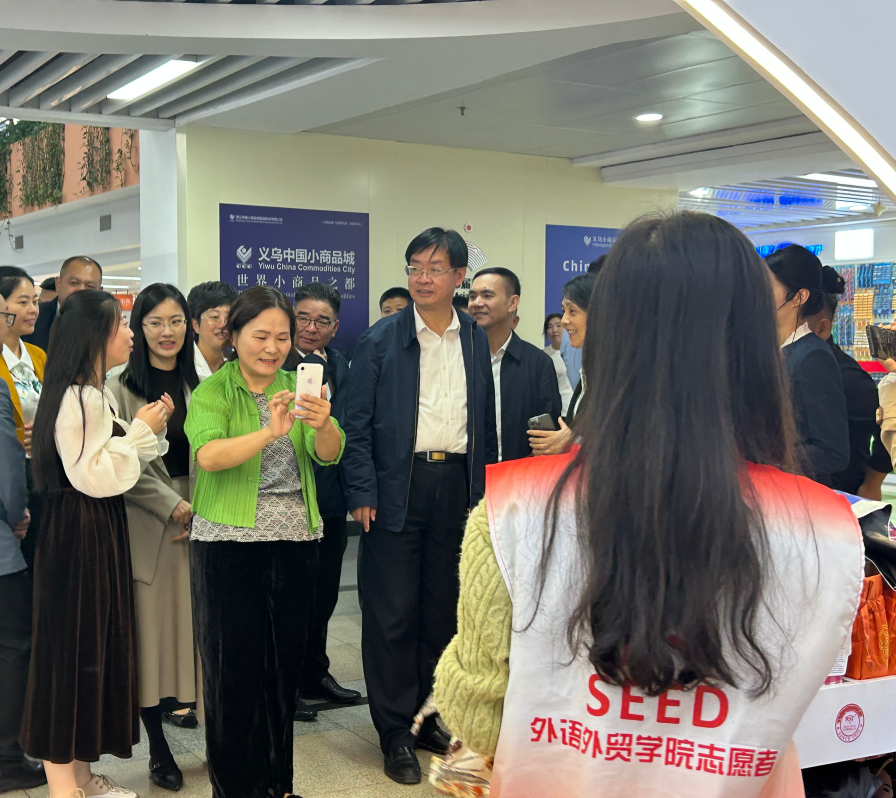 10月20日下午,国家发改委社会司刘明司长沿着习近平总书记考察路线足迹,深入调研义乌民营经济发展情况,并现场感受义乌“莫名其妙、无中生有、点石成金”的创新创业精神。在参观国际商贸城二区途中,刘明司长对我校正在开展多语种跨境电商直播的学生表示了充分的肯定。