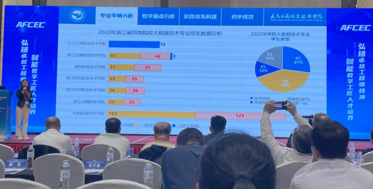 年会设计了三个研讨议题:(1)产教融合,优化专业实践教学训练体系,达成数字工匠人才培养目标,(2)弘扬卓越工程师精神,探索高职学生数字素养和职业素养培养方式方法,(3)基于高等教育分类发展和职业教育体系建设的高职本科专业建设。吴俊老师在第一个研讨议题部分作了《大数据技术专业分层分类实践教学体系探索与实践》的主题报告,报告中指出学院大数据技术专业以“崇尚革故鼎新”的义乌精神为核心,紧密把握时代发展的趋势,积极推动分层分类实践教学体系的探索与实践。从“专业学情分析、教学痛点分析、实践体系构建、初步成效”等多个角度,展示了适应义乌产业需求与人才培养特点的特色实践教学体系。