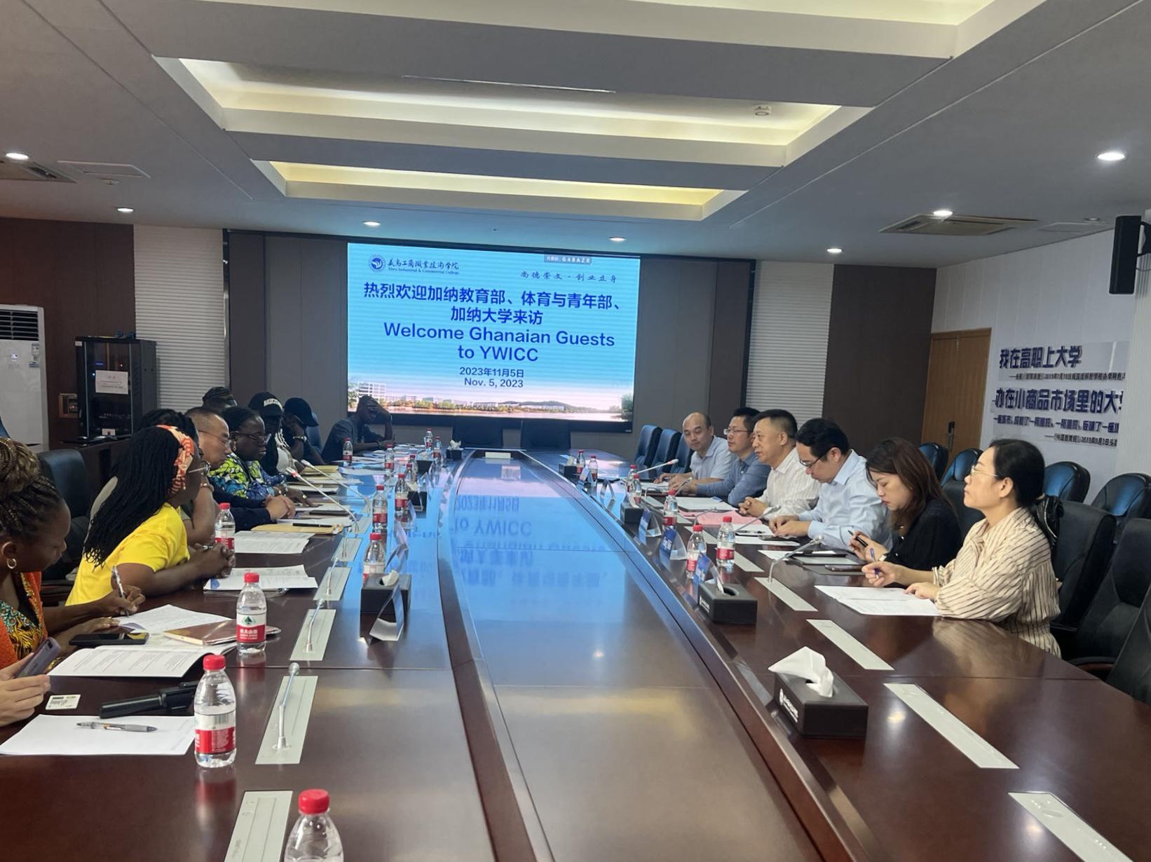 11月5日,加纳教育部、加纳体育与青年部、加纳大学教育访华团一行12人来我校访问交流,洽谈合作事宜,访问团由加纳教育部职业教育技术和培训委员会主席安平、加纳体育与青年部大司长卡尔泰、加纳大学常务副校长安佛、加纳大学教务长蒙萨、浙江工业大学-加纳大学孔子学院中方院长王吉民等政府官员和校方管理人员组成。党委委员、副院长樊曜会见来宾,国际处、创业学院负责人和相关工作人员参加会谈。
