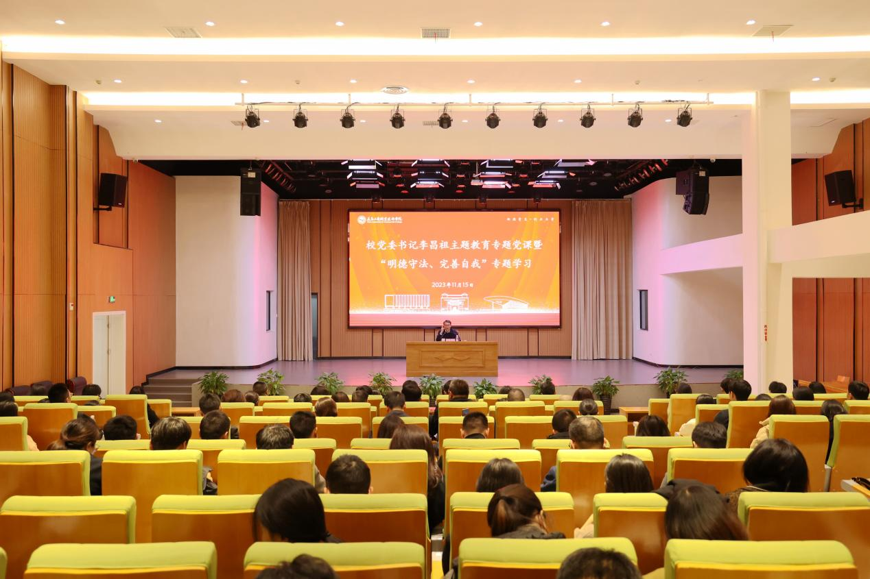 为深入开展学习贯彻习近平新时代中国特色社会主义思想主题教育,开展青年干部“明德守法、完善自我”专项行动,11月15日下午,党委书记李昌祖在大学生活动中心麦穗报告厅作主题教育专题党课暨“明德守法、完善自我”专题学习辅导。学校中层干部、青年干部、思政教师、党员师生代表等200余人参加会议。