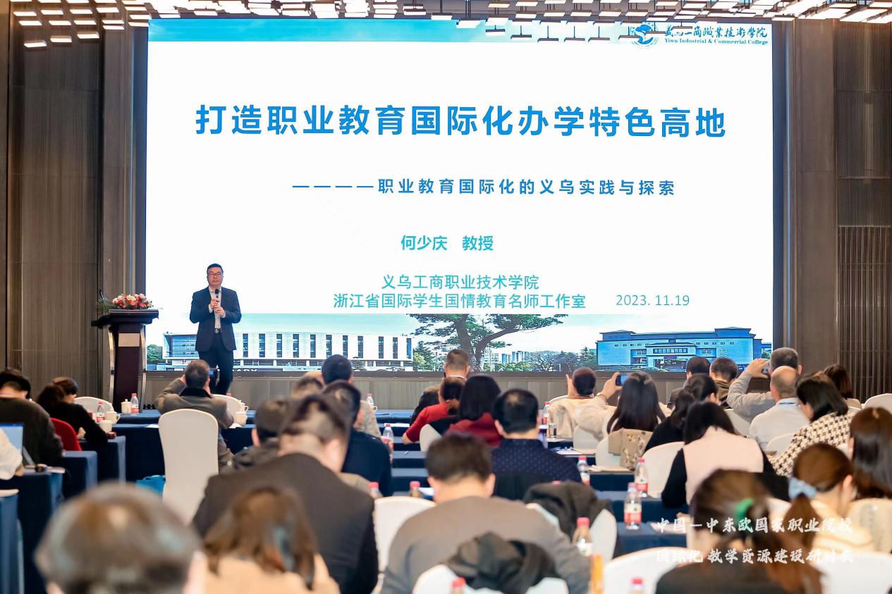 何少庆作了《打造职业教育国际化办学特色高地——职业教育国际化的义乌实践与探索》主题报告,分享了学校坚持“根植义乌、服务区域、走向国际”的办学定位,紧密依托义乌国际化市场优势,以特色教育为载体,全力推进教育国际化,打造国际化办学特色高地的经验。