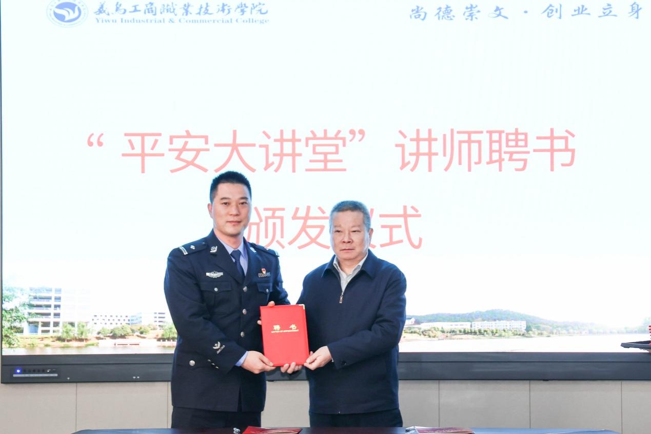 在全场的共同见证下,义乌市公安局党委委员、市反恐办常务副主任马小青和樊曜副院长签订警校共建平安校园协议书。接着,宋寅寨副市长与马广院长为学校“平安驿站”揭牌。随后,马广院长为学校“平安大讲堂”讲师代表颁发聘书。