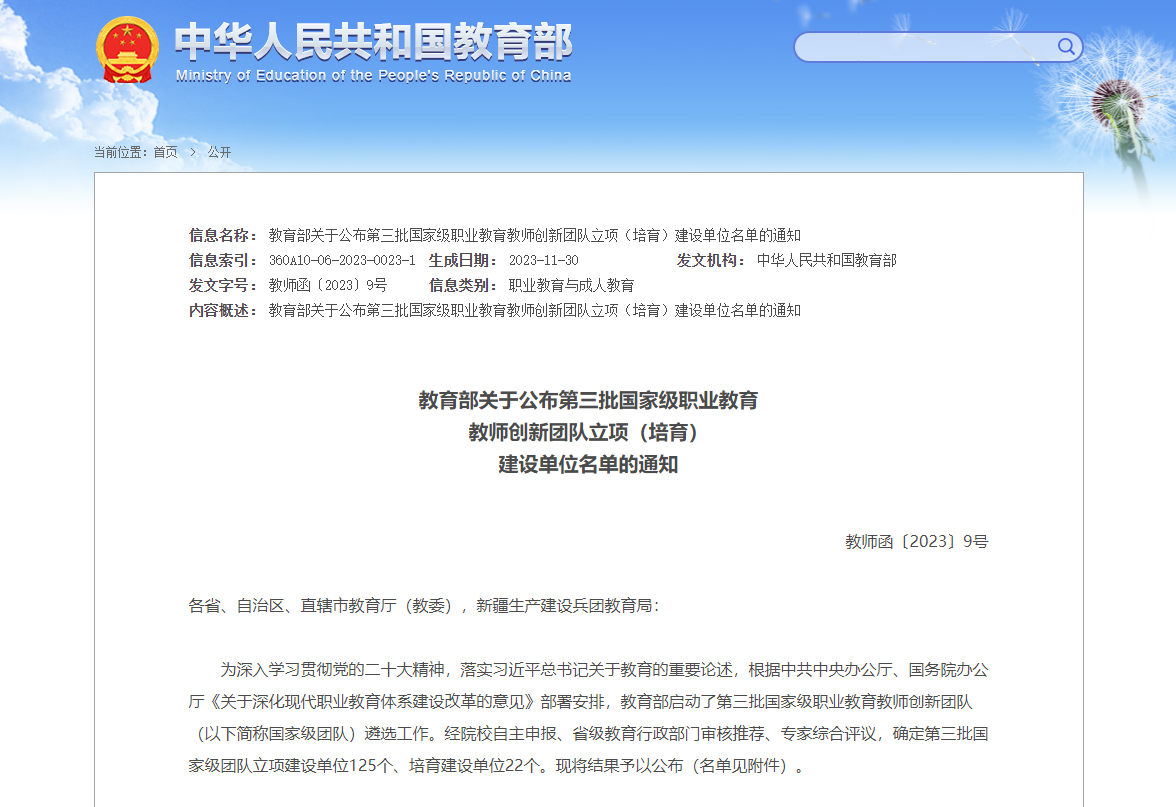 近日,教育部发布了《教育部关于公布第三批国家级职业教育教师创新团队立项(培育)建设单位名单的通知》,我校国际经济与贸易专业教学团队入选第三批国家级职业教育教师创新团队培育建设单位。