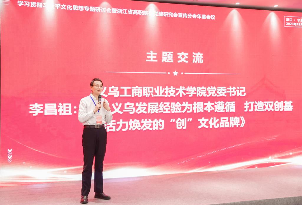 党委书记李昌祖作题为《以义乌发展经验为根本遵循 打造双创基因活力焕发的“创”文化品牌》报告,介绍学校“创”文化建设经验与实践育人典型案例。李昌祖指出,学校以习近平新时代中国特色社会主义思想为指导,全面贯彻党的教育方针,全面落实立德树人根本任务,扎根《共产党宣言》中文版首译地、“世界小商品之都”义乌,把信仰之源作为首要思政元素,以义乌发展经验为根本遵循,与市场共舞,创新开展校本整体性、系统化育人品牌“麦穗”计划,构建“一核引领、三纵进阶、四横共融、五位一体”的“创”文化育人体系,依托“五大工程”激活双创基因,营造创新创业人才成长的良好生态,打造活力焕发的“创”文化品牌。他在报告中从创业写进校训、创业成果丰硕、社会口碑优秀和学生创业率高4个方面介绍了学校“创”文化的实践样态,并以精神文化传承工程、制度文化培育工程、行为文化塑造工程、环境文化提升工程为演进路径,分享了文化育人的具体做法。李昌祖在报告中运用了李祖村“创客”杨聪云、“互联网+”“挑战杯”金奖“双冠王”何宇迪、“芒果小哥”李健松等毕业生、在校生鲜活生动的创业案例,在现场引起强烈反响。