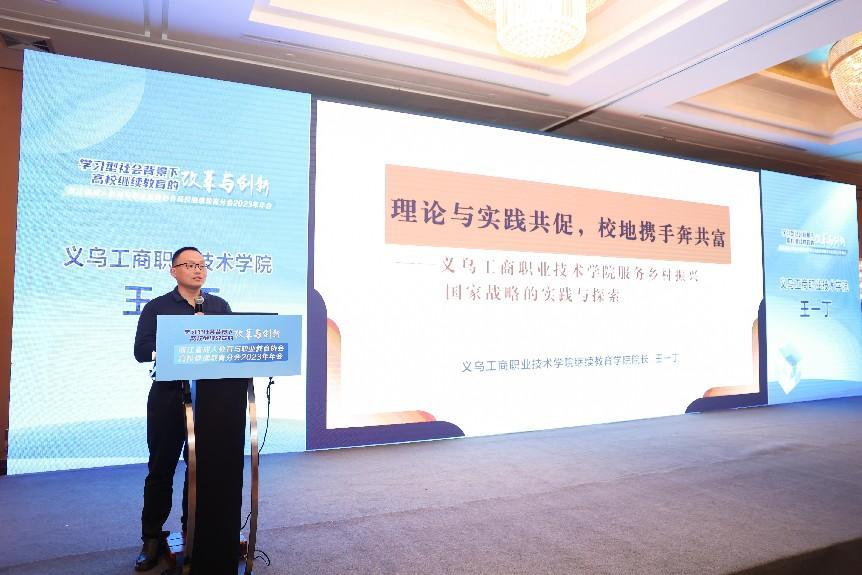 继续教育学院负责人代表学校在会上发表题为《理论与实践共促,校地携手奔共富——义乌工商职业技术学院服务乡村振兴国家战略的实践与探索》的报告,阐述我校在服务乡村振兴工作中的情况、经验与典型案例。近年来,我校遵循“义乌发展经验”,秉持“尚德崇文创业立身”的校训精神,立足“根植义乌、服务区域、走向国际”的办学定位,走出一条以“创”立校的特色办学之路。