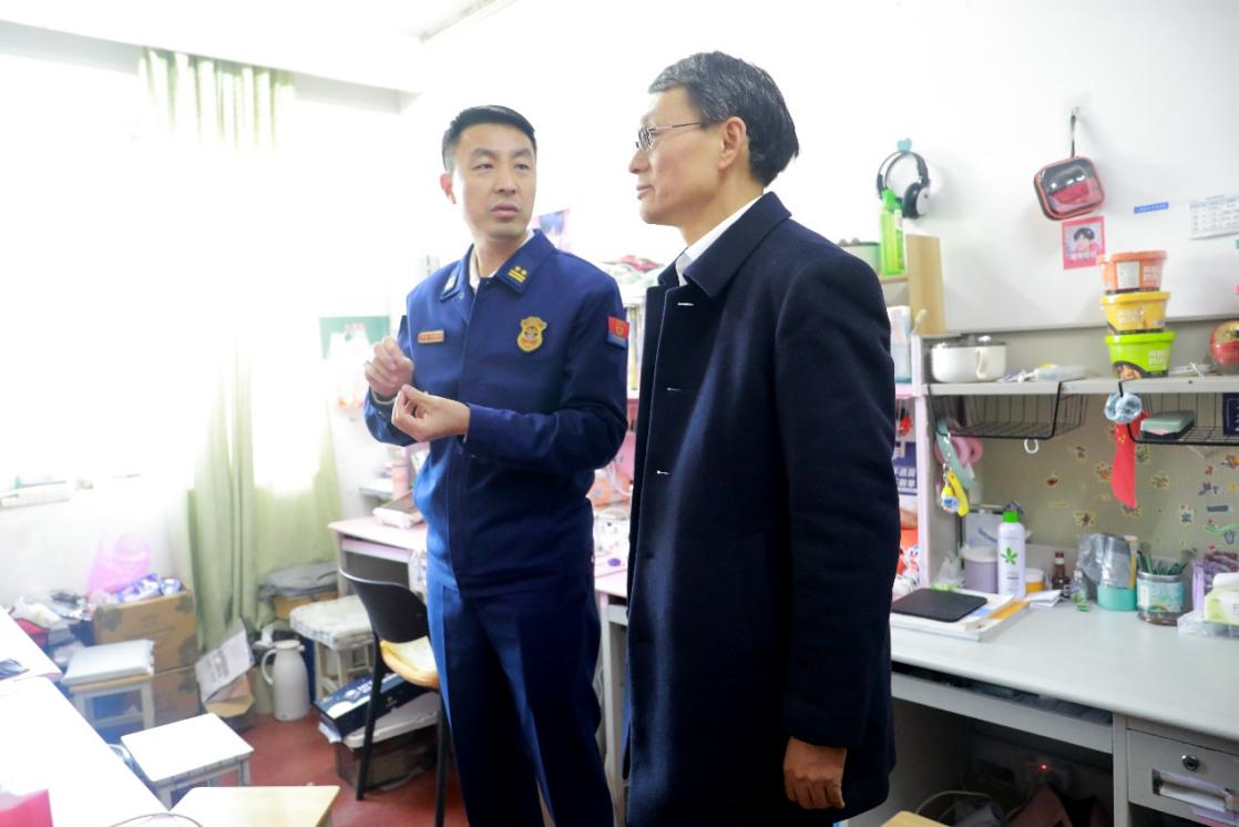 1月3日,义乌市消防救援支队政委唐继文、副支队长韩波、江东街道常务副主任陈健一行5人来我校调研指导消防安全工作。校党委书记李昌祖,党委委员、副院长樊曜以及学校办公室、学生处、后勤处、校安处等部门负责人陪同实地走访。