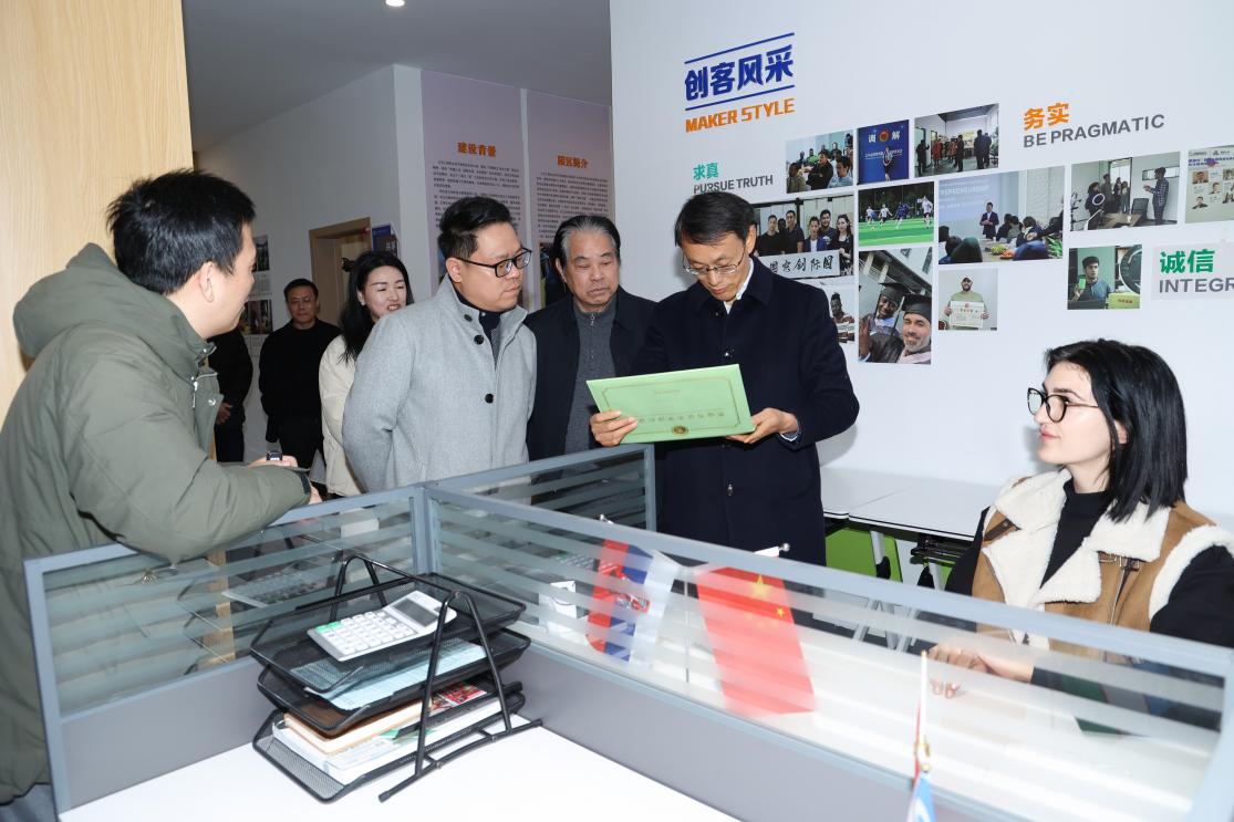 1月5日,中国商业联合会商品交易市场专业委员会主任骆汉平一行来校调研交流,走访参观了学校国际教育学院、创业园、创意园。原中国商业联合会副会长骆毓龙,学校党委书记李昌祖、副院长盛湘君陪同调研。