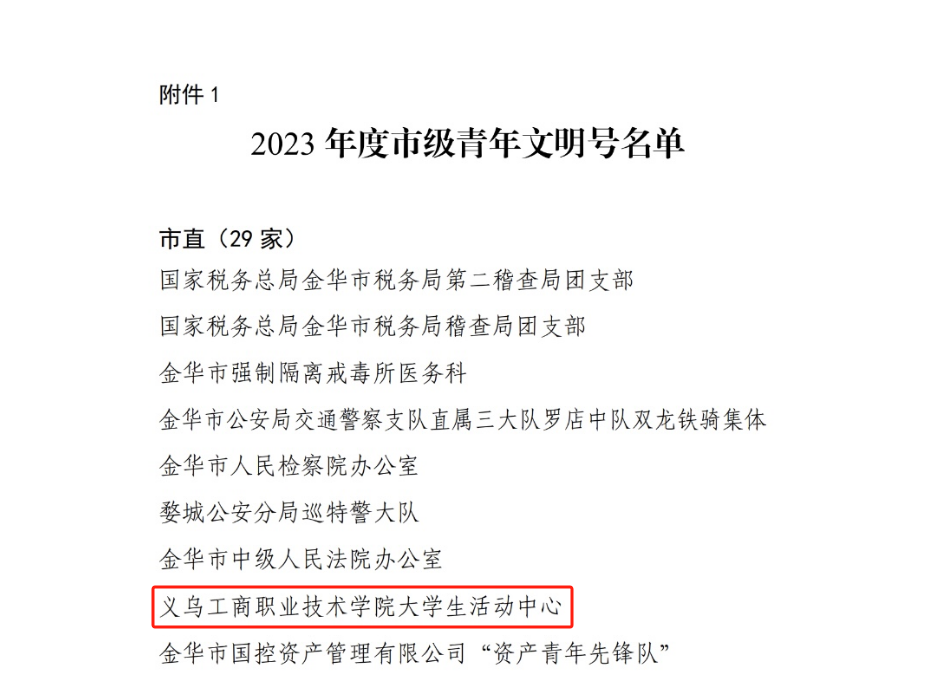 近日,金华市“双争”活动指导委员会印发《关于命名表彰2023年度市级青年文明号和青年岗位能手的决定》,我校大学生活动中心成功获评2023年度金华市级青年文明号。
