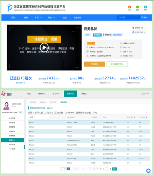 《商务礼仪》课程团队注重因材施教,实施“课前学礼、课中明礼、课后行礼”教学流程,打造“言语美、仪态美、情感美”的训练课堂,走出了基于共同富裕项目的礼仪课程思政实施路径。2017年以来,团队已完成两套课程教学和职场岗位训练视频、一部省级新形态配套教材、一套学生训练及模拟影像集等多项教学资源,在三个面向全国开放的资源平台共享,已惠及31068人。
