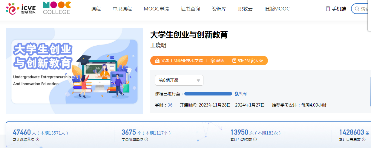 《大学生创业与创新教育》是一门定位于高职高专学生与社会初学者认知创新创业规律和特征、把握创新创业机遇的课程。课程以创业创新理论、市场营销理论和消费者行为理论为基础,结合具体的创业案例,从问题出发,传授创业创新知识,学习者能够通过本课程学习全面掌握双创基本原理,培养双创精神,提升双创能力。目前,课程资源陆续被安徽商贸职业技术学院、昆明冶金高等专科学校等8省近20所高校申请使用。课程用户所在高校分布超过400所,学习人数达30000余人次,互动总量超过80万次。