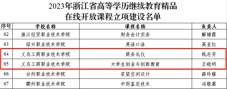 近日,浙江省教育厅发布2023年浙江省高等学历继续教育精品在线开放课程立项建设名单,我校申报的《大学生创业与创新教育》和《商务礼仪》两门课程被确定立项为省级高等学历继续教育精品在线开放课程,实现了学校在学历继续教育课程建设方面的新突破。