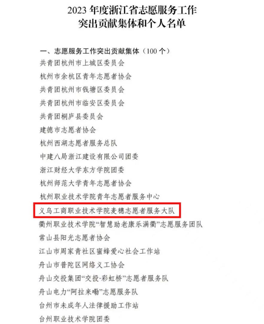 近日,共青团浙江省委、浙江省志愿者协会公布2023年度浙江省志愿服务工作突出贡献集体和突出贡献个人通报表扬名单,我校麦穗志愿者服务大队获评2023年度浙江省志愿服务工作突出贡献集体。