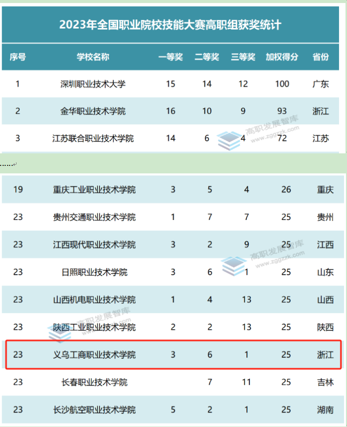 4月16日,全国职业院校技能大赛执行委员会正式公示了2023年全国职业院校技能大赛国赛获奖名单,高职发展智库对高职院校获奖情况做了详细统计,发布了《2023年全国职业院校技能大赛高职院校获奖数排行榜》,我校排名全国第23名,位列浙江省高职院校第2名。