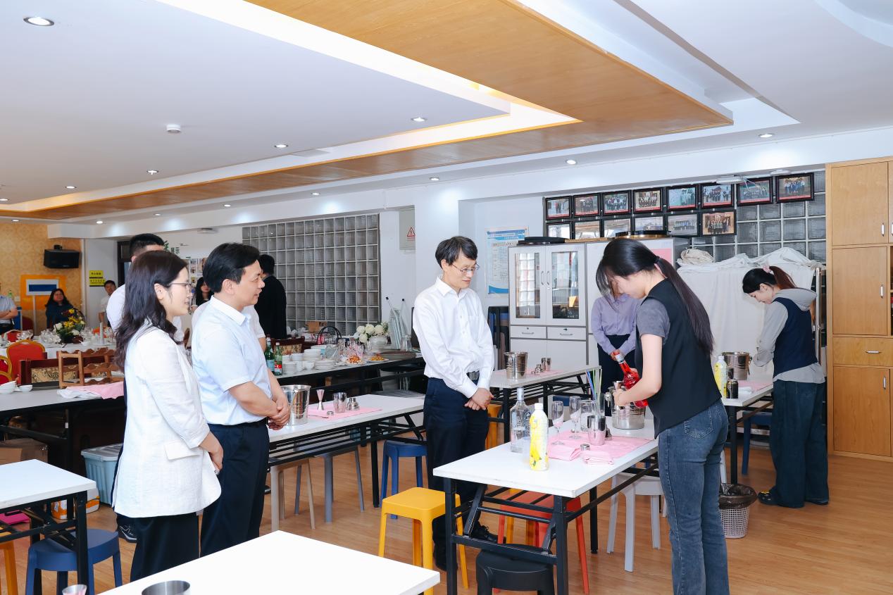 与会人员实地走访了人文旅游学院实训室和外语外贸学院数字贸易实训基地。在人文旅游学院的新媒体综合实训室,大家观看了AI智慧旅游平台的景区全景实训系统,实现景区720度“云”游览;在餐厅实训室,大家观看了酒店管理与数字化运营专业学生的调酒技能展示。党委书记李昌祖与技能展示学子进行了亲切交流,详细询问了她们在校的学习情况、生活情况和未来规划。他嘱咐同学们要认真学习,加强技能练习,用技能反馈家庭、感恩父母。