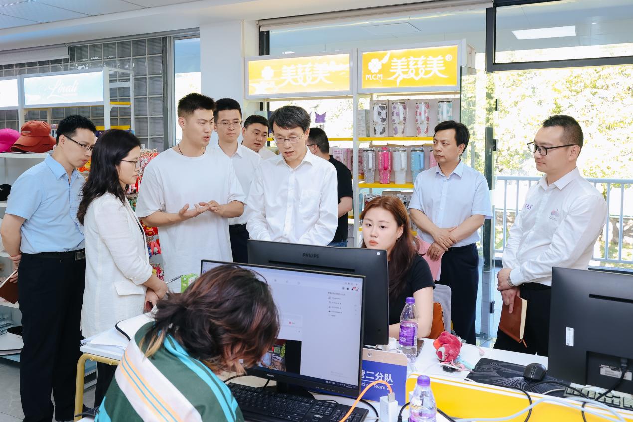 在外语外贸学院,与会人员参观了文化墙和数字贸易实训基地建设。在数字品牌AI运营实训室,李昌祖详细了解了AI电商直播的运行原理和建设情况。他指出,AI直播是当下电商直播产业催生出的新质生产力,要打造具有义乌工商职院特色的AI直播模式并输出到国际商贸城,为广大商户提供精准直播策略,服务世界小商品之都建设。