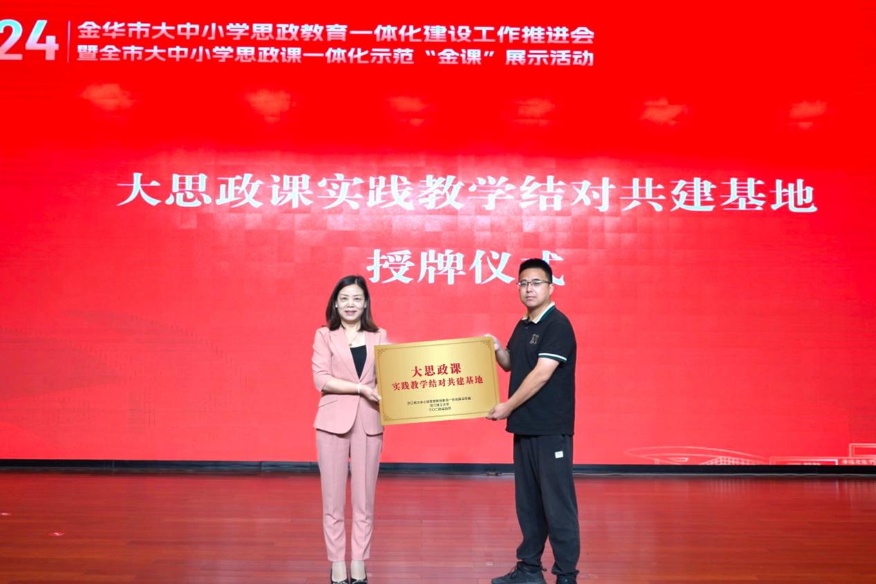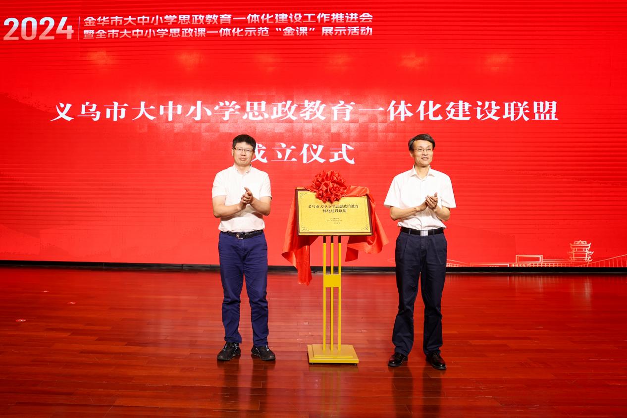 义乌市教育局党委委员、副局长吴彩军和李昌祖共同为“义乌市大中小学思想政治教育一体化建设联盟”揭牌。