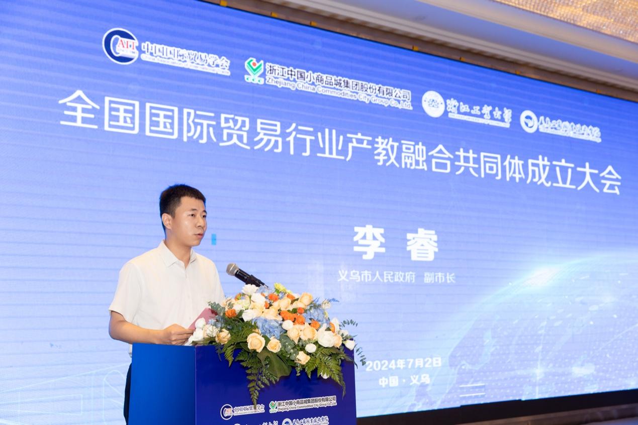 李睿在致辞中表示,对外贸易是义乌最鲜明的一个底色,总书记给义乌的定位就是世界小商品之都。义乌工商职业技术学院是义乌唯一的一所高等职业院校,是培育国际贸易人才的摇篮。成立全国国际贸易行业产教融合共同体是推动国际贸易行业发展的重要抓手,是深化产教融合,加强产学研合作,是未来高等教育发展的选择。义乌市政府将不遗余力的支持共同体建设,支持共同体不断汇集产业资源、创新人才培养模式、培养更多高素质外贸人才,推动全行业的共同发展。