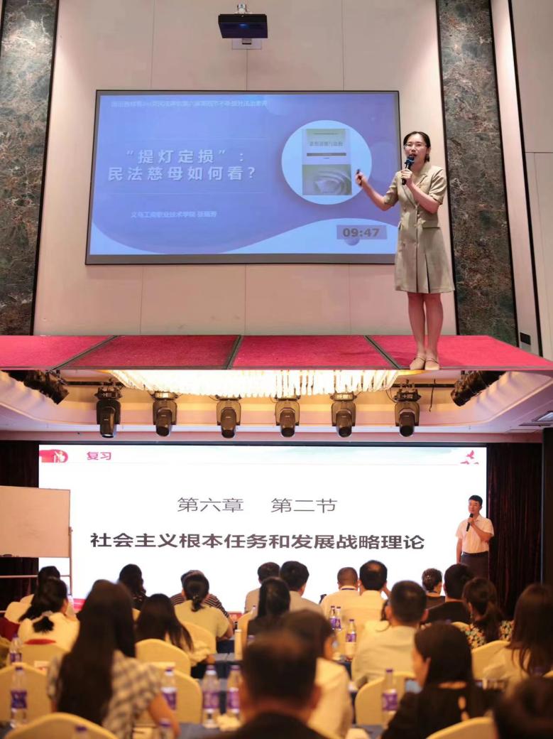 据悉,在讲课比赛环节,《思想道德与法治》课和《毛泽东思想和中国特色社会主义理论体系概论》课程分别有46位和22位选手参与其中,同台竞技。在讲课比赛中,张瑞芳老师以《“提灯定损”:民法慈母如何看?》为主题,以“‘提灯定损’受损的到底是什么?”从民法基本原则的角度分析“提灯定损”事件的原因和“‘提灯定损’后如何止损求赢?”三个问题为线索进行授课。邢运老师以《改革开放是决定当代中国命运的关键一招》为主题,从“寻改革开放之困”“思改革开放之路”和“探改革开放之实”三个维度展开教学。两位老师凭借着扎实的理论功底、生动的教学设计和优异的现场表现,在激烈的竞争中脱颖而出,斩获佳绩。