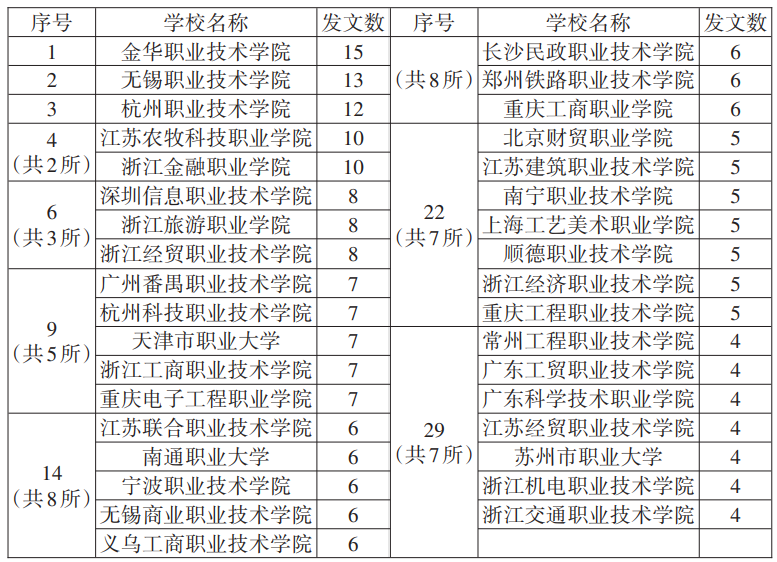 2023年公办高职高专院校发表职业教育科研论文情况(4篇及以上) 本次职业教育科研论文统计范围为2023年27家教育类中文核心期刊,即《职教论坛》《中国职业技术教育》《职业技术教育》《教育与职业》4家被《中文核心期刊要目总览》收录的职业教育类中文期刊,以及23家教育类中文核心期刊。 近年来,学校以“双高校”建设为载体,高度重视职业教育研究工作,将其作为推动学校深化改革创新、高质量发展的重要抓手。同时,学校鼓励教师聚焦新时代重大理论实践问题、职业教育改革等前沿问题,结合自身工作实践开展研究,为学校高质量发展提供智力支持。本次刊发的6篇论文聚焦现代学徒制、数字化、科教融汇、课程思政等等关键词,体现了学校教师较高的科研学术水平,为职业教育科研贡献了“义乌工商”智慧。