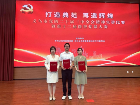 近日,由中共金华市委宣传部主办的“时代使命 金华答卷”全市新时代理论宣讲大赛暨微型党课比赛在“婺江潮声”理论宣讲孵化基地和金东人文博览中心举行。另外,“打造典范、再造辉煌”义乌市党的二十届三中全会精神宣讲比赛暨第十二届微型党课大赛决赛在市委党校举行。我校教师在两场比赛中均表现出色、喜获佳绩。