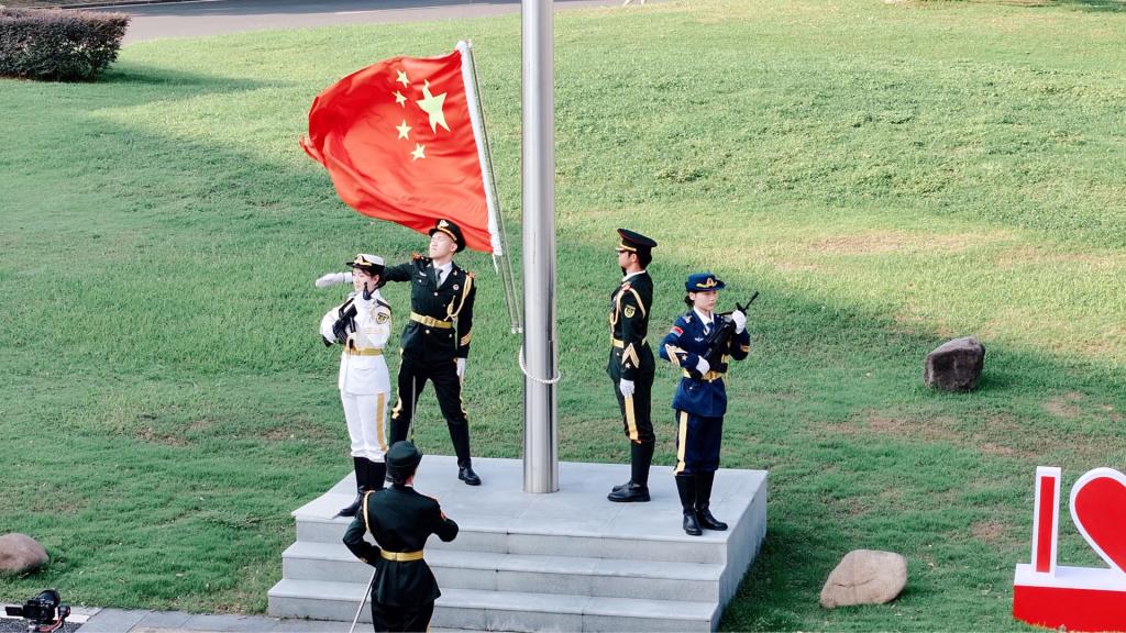 伴着初升的朝阳,校国旗护卫队迈着整齐划一、铿锵有力的步伐,护送着五星红旗正步走向旗杆。全体师生面向国旗肃立致礼,齐唱国歌。师生们注视着五星红旗冉冉升起,在熠熠晨光中迎风飘扬。