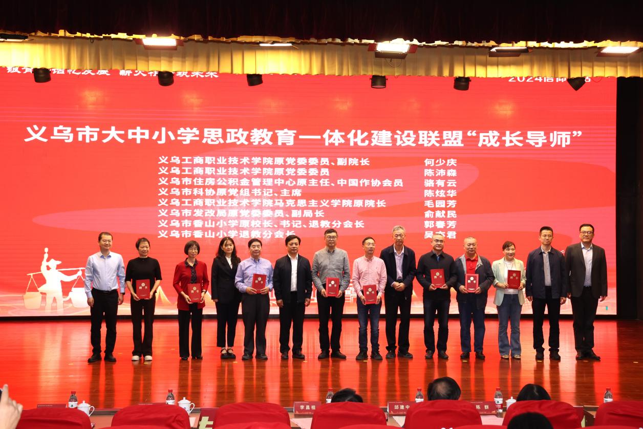 会议还举行了“大中小学思政教育一体化”师资聘书颁发仪式。吴伟兴、叶斯源、彭春燕、郑伟俊等领导为出席的老干部、老教师颁发义乌市大中小学思政教育一体化建设联盟“成长导师”聘书。