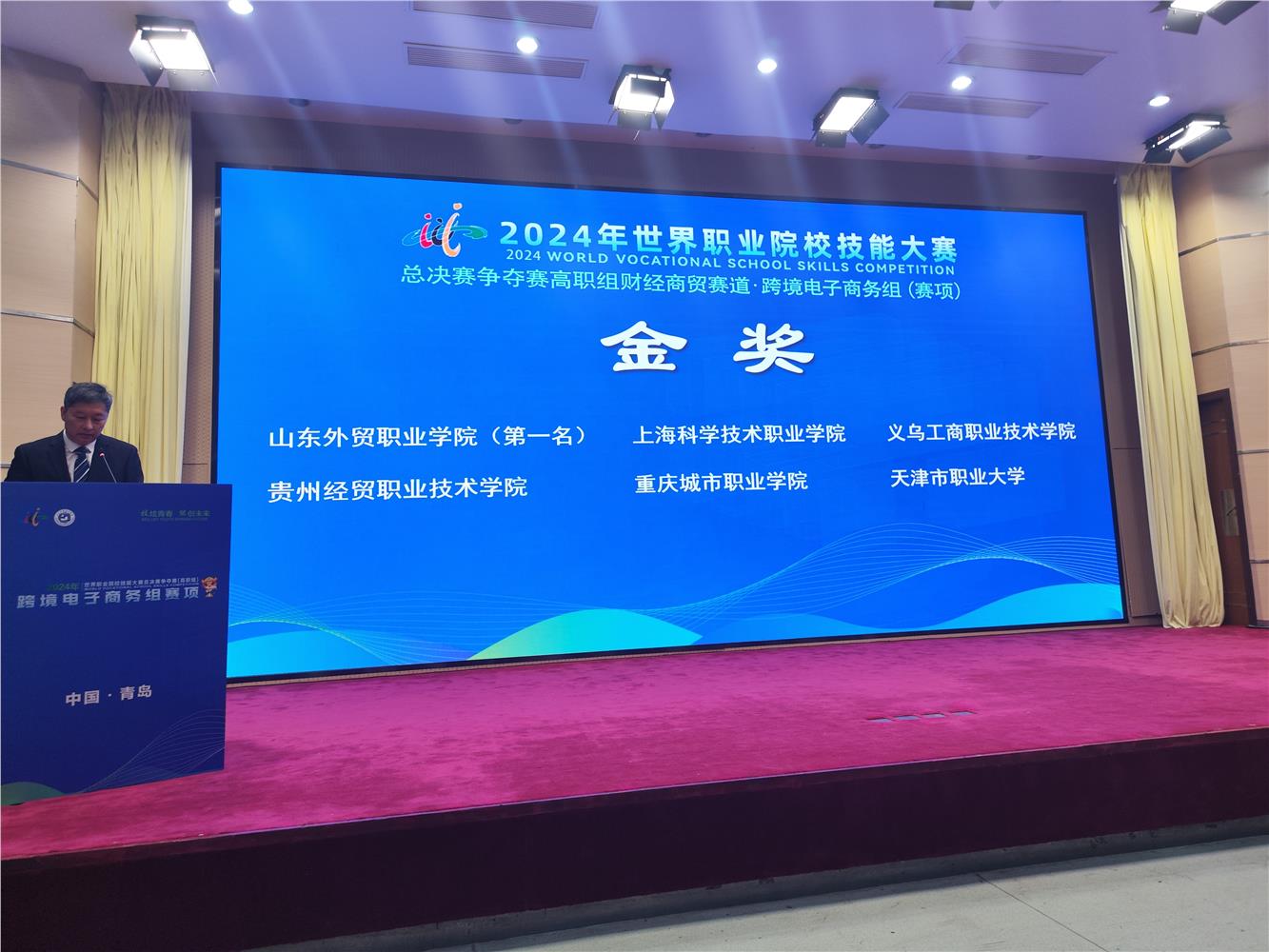 10月27日-10月28日,2024年世界职业院校技能大赛总决赛争夺赛财经商贸赛道四“跨境电子商务”赛项在山东外贸职业学院举行,来自全国各地高职院校的60支代表队展开激烈比拼,由创业学院李春丽、金祖旭二位老师指导,跨境电子商务专业陈烨、方远航、蒋金颖、孙巾山四位同学组成的参赛团队喜获金奖。