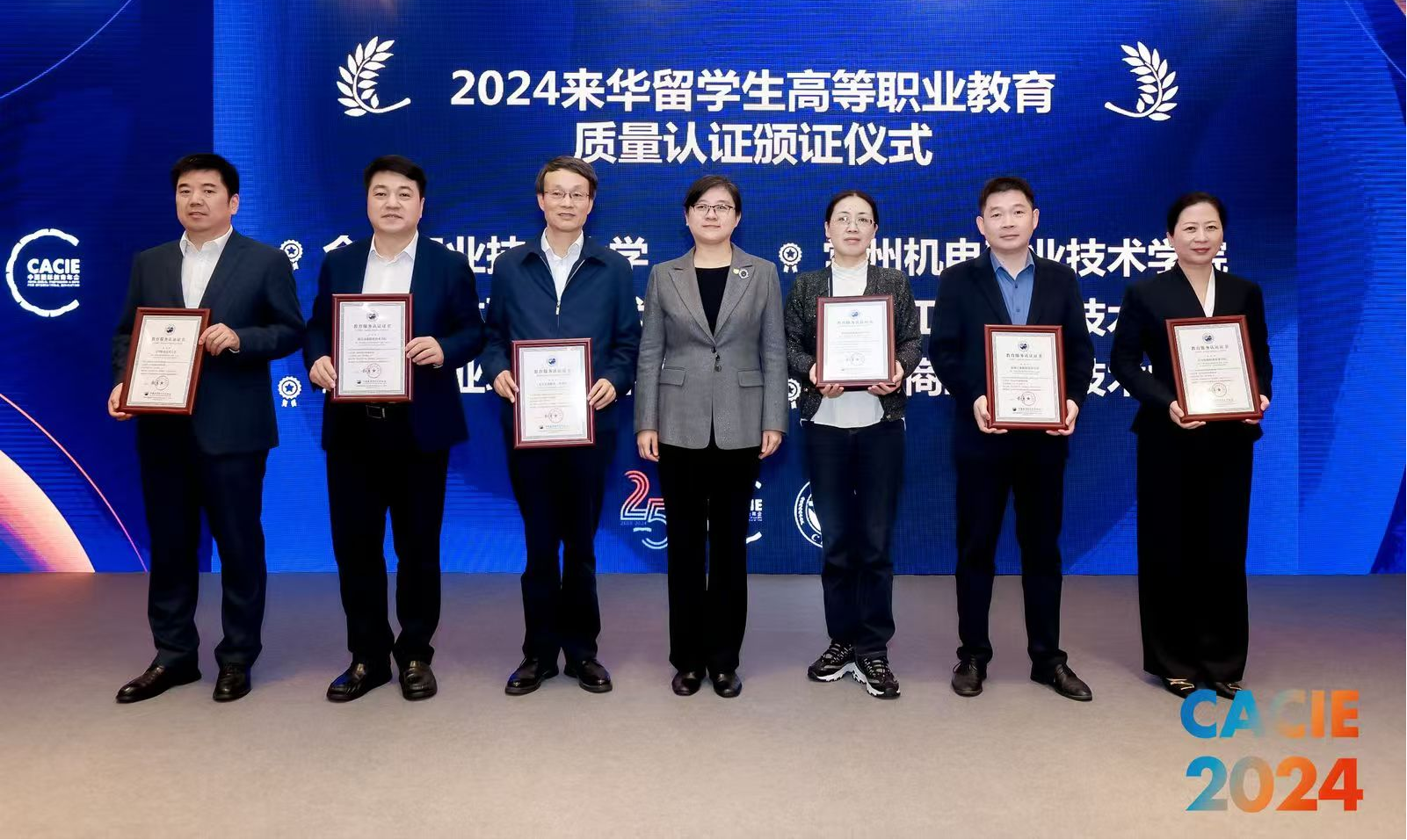 10月31日,由中国教育国际交流协会主办的第25届中国国际教育年会在北京国家会议中心举行。年会上举行了来华留学生高等职业教育质量认证颁证仪式,15所职业院校获颁教育服务认证证书。我校在初次认证中取得了六年认证有效期、评价等级B级的好成绩,学校党委书记李昌祖代表学校接受现场颁证。中国教育国际交流协会副秘书长安延以及来自国内外院校、国际教育机构的200余位代表出席会议和颁证仪式。
