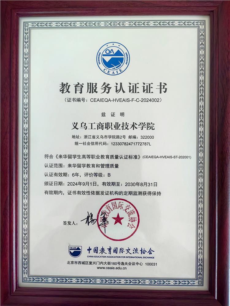 来华留学生高等教育质量认证是由教育部指导,中国教育国际交流协会实施的权威度高、专业性强、影响力广的质量保障活动,对来华留学教育高质量发展起到了极大的推动作用。我校高度重视来华留学生高等职业教育质量认证工作。此次顺利通过来华留学生高等教育质量认证,助推我校国际教育工作高水平发展。学校坚持“以评促改、以评促建”,针对质量认证提出的整改意见,加强顶层设计,系统谋划学校来华留学教育,服务国家战略和地区经济发展,擦亮“留学义乌”留学品牌,助推学校双高校建设和国际化建设。