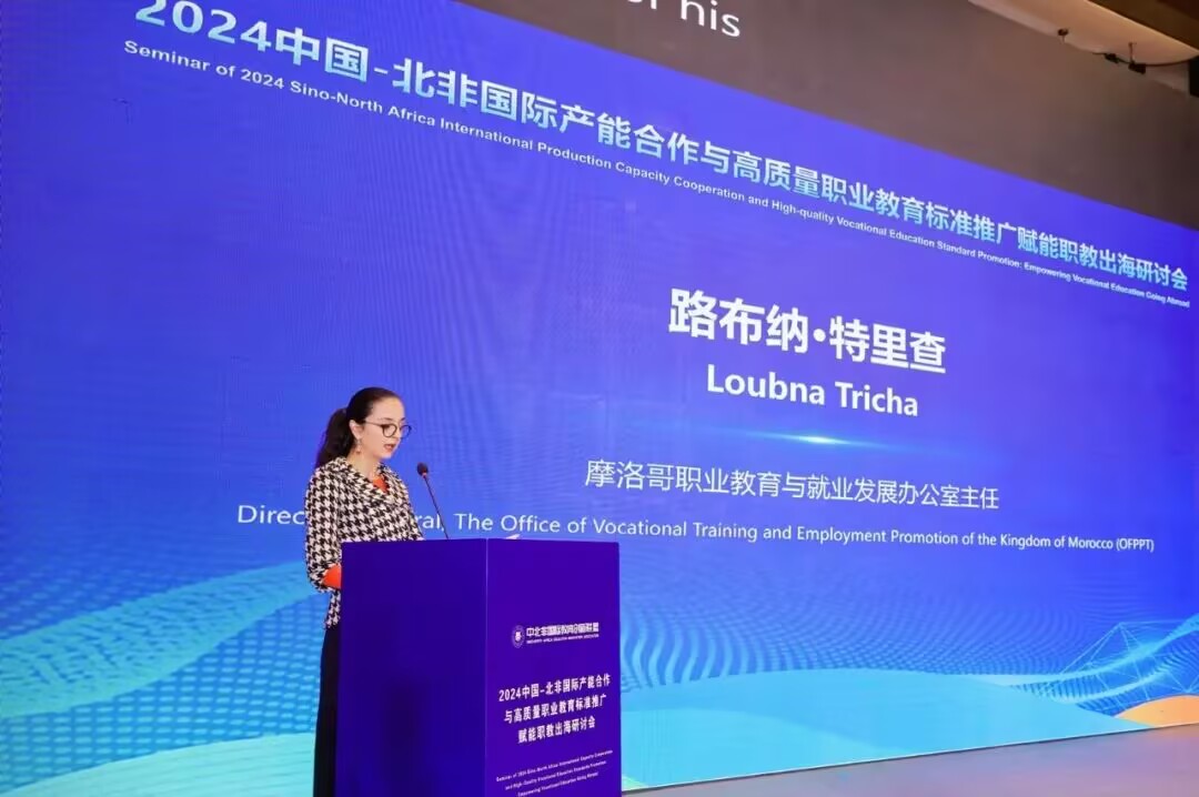 摩洛哥职业教育与就业发展办公室总干事路布纳·特里查在致辞中分享了摩洛哥职业教育的现状及合作领域需求,表示对中摩教育的合作充满信心。她表示教育国际合作将为摩洛哥培养符合国际市场需求的专业人才,推动经济发展,促进两国教育文化交流,并对我校摩洛哥义乌商学院为摩洛哥青年开展的跨境电商等培训给予了肯定。