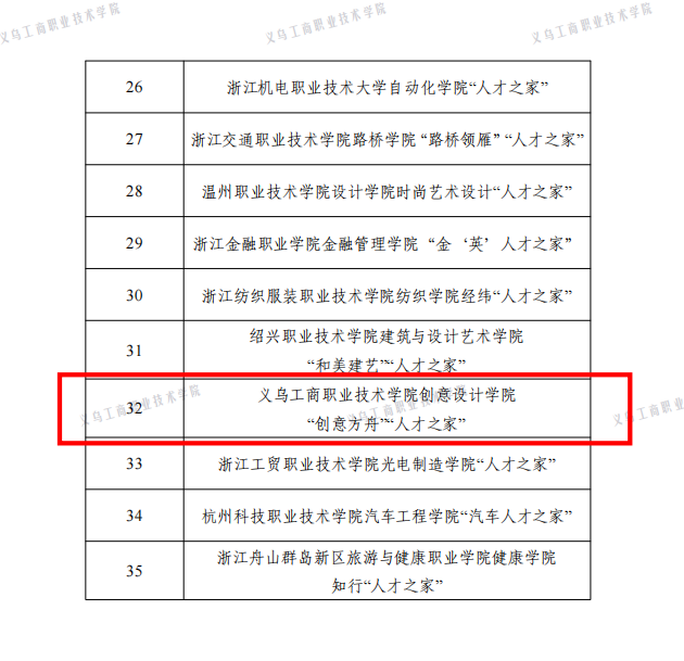 近日,中共浙江省委教育工作委员会办公室公布了高校“人才家园”建设工程首批重点建设单位名单,义乌工商职业技术学院创意设计学院“创意方舟”人才之家成功入选首批“人才之家”重点建设单位。