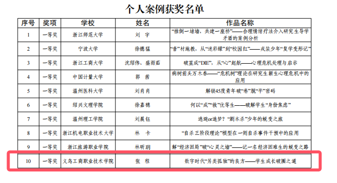 近日,由浙江省教育厅、浙江省高等教育学会思想政治教育研究分会组织开展的第七届浙江省高校辅导员工作案例大赛获奖名单揭晓。我校辅导员张程、骆晓颖撰写的案例在本次大赛中脱颖而出,分别斩获一、二等奖。