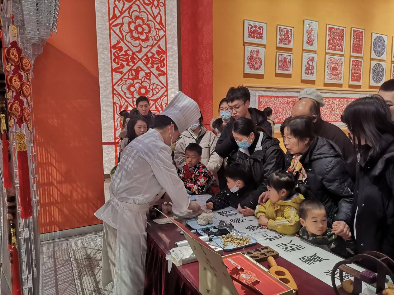 大红灯笼高高挂起,各式非遗展品琳琅满目,人声鼎沸,热闹非凡。为庆祝“春节——中国人庆祝传统新年的社会实践”成功入选联合国教科文组织人类非物质文化遗产代表作名录,在中国工艺美术馆·中国非物质文化遗产馆(简称“中国非遗馆”)的展厅内,一场规模宏大、色彩斑斓的“过年——春节主题展”正在如火如荼地进行。在这一片繁华之中,婺式糕点代表性传承人楼洪亮——义乌工商职业技术学院教师,浙江省高技能拔尖人才,浙江金蓝领,浙江省技能大师工作室领办人,携其团队为观众带来一场视觉与味觉的双重盛宴。