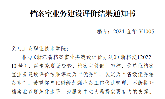 近日,浙江省档案局下发《浙江省档案室业务建设水平评价结果通知书》,我校档案室获评浙江省“省级优秀档案室”。