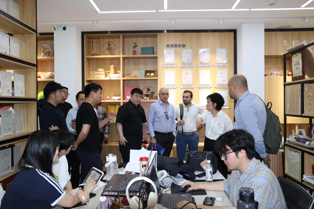 教学团队交流结束后,代表团一行实地参观了我校创意园,重点走访了曼德设计有限公司、义乌市木马设计有限公司等入驻企业。企业负责人详细介绍了“项目嵌入课堂”“学徒制”等校企协同育人模式,展示了学生参与完成的产品设计方案、市场落地成果及创新创业项目。卡罗·尼吉对园区“教育链、产业链、创新链”深度融合的实践模式表示高度赞赏,认为双方在合作办学资源对接方面可以探索更多合作可能。
