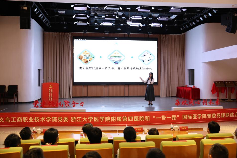 颁发聘书环节,李昌祖、叶斯源为医生代表颁发“义乌工商职业技术学院特邀健康顾问”聘书,王凯、李伟为学校小语种教师代表颁发“浙江大学医学院附属第四医院健康使者”聘书。双方小语种、国际教育、工会等相关工作负责人上台,为“党建联建单位”揭牌。与会人员共同观看微党课《“盒”开见义》。