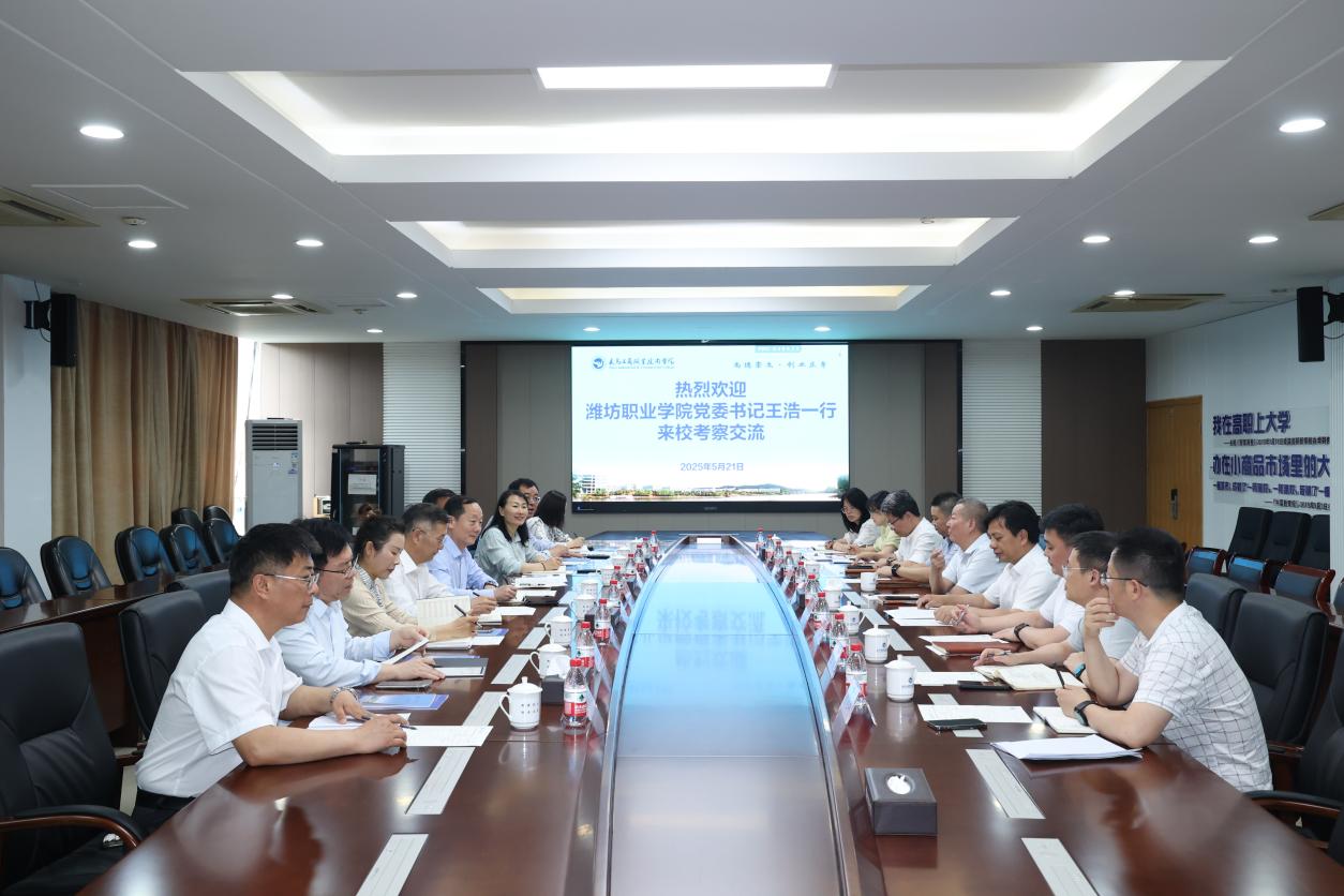 5月21日上午,潍坊职业学院党委书记王浩一行9人来校考察调研。学校院长马广、党委副书记叶斯源,党委委员、办公室主任高燕及教务处、人事处、校企合作处、科技处、外语外贸学院、经济管理学院等相关负责人陪同调研并参加交流座谈。