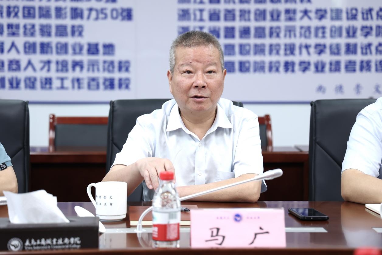 马广对渤海大学及企业领导一行的到访表示热烈欢迎。他围绕学校发展历程、办学定位及“创业教育、创意教育、国际教育”三大办学特色展开详细介绍。他强调,学校始终以服务区域经济发展为导向,通过深化校企合作、校际联动,构建了多层次协同育人体系。他希望以此次交流为契机,推动两校在人才培养、资源共享等方面实现优势互补,共拓职业教育高质量发展新空间。