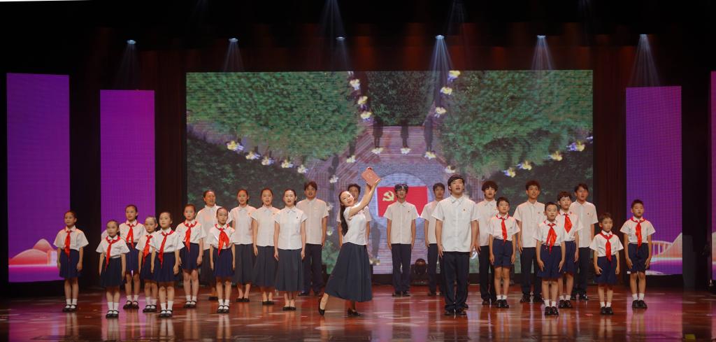 “真理的味道非常甜,对你的渴望奔流心田……”来自学校创意设计学院、浙江省机电技师学院、义乌市绣湖小学、义乌市上溪镇溪华小学的26名师生,联袂演绎《真理的味道》,清亮童声与铿锵和声交织,以“蘸墨吃粽”经典故事为引,唱响陈望道追寻真理的动人乐章。