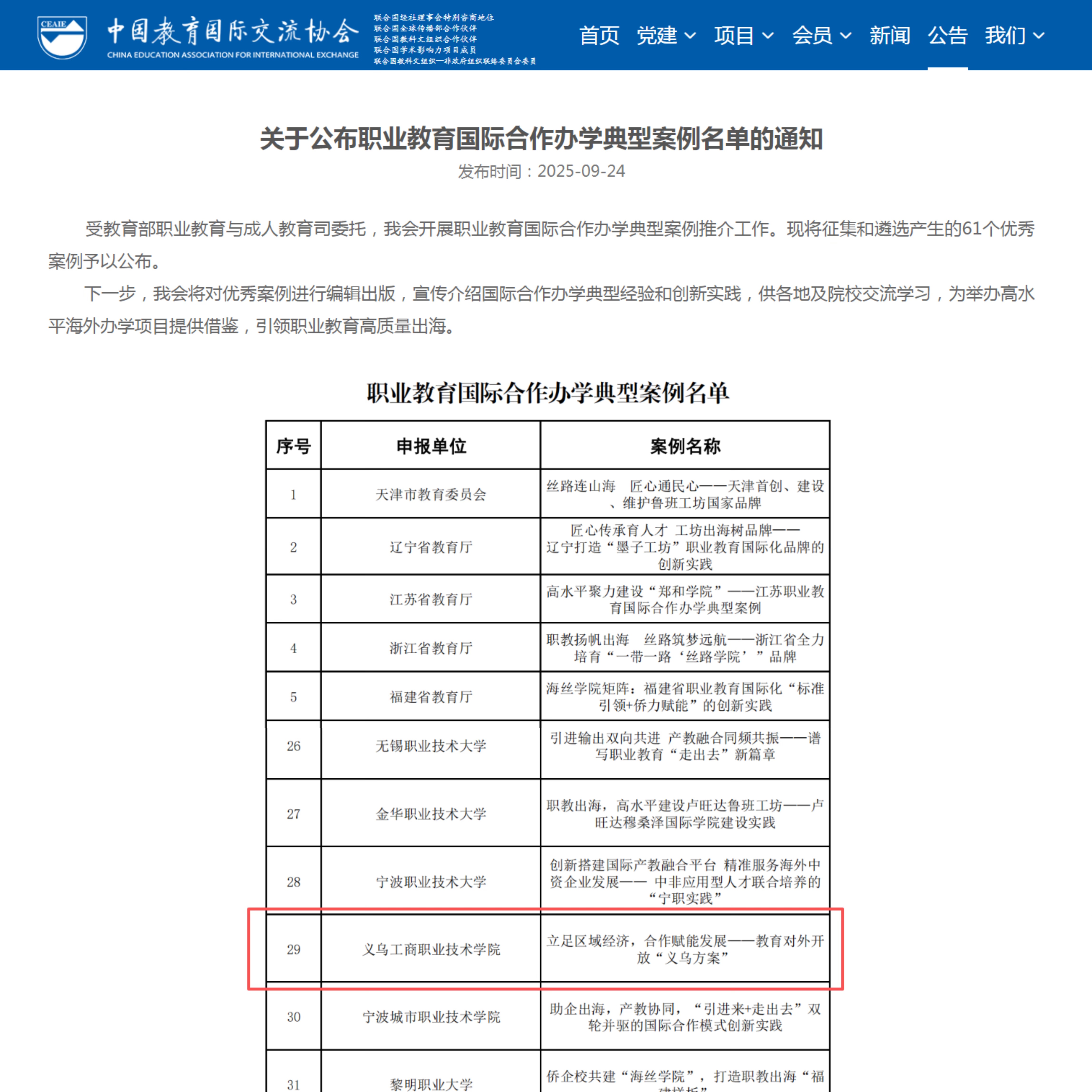 9月24日,中国教育国际交流协会公布职业教育国际合作办学典型案例名单,学校报送的案例《立足区域经济,合作赋能发展——教育对外开放“义乌方案”》成功入选!