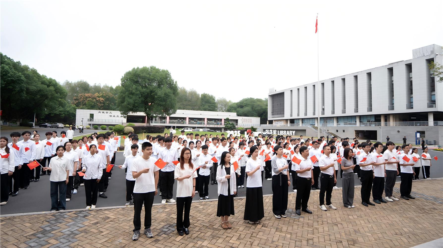 “五星红旗迎风飘扬,胜利歌声多么响亮……”活动在师生同唱《歌唱祖国》的歌声中结束。升旗仪式结束后,青年师生们现场参观了“我和国旗合个影”优秀作品展,定格义乌工商学子与国旗同框的动人画面,透过镜头传递炽热的家国情怀。