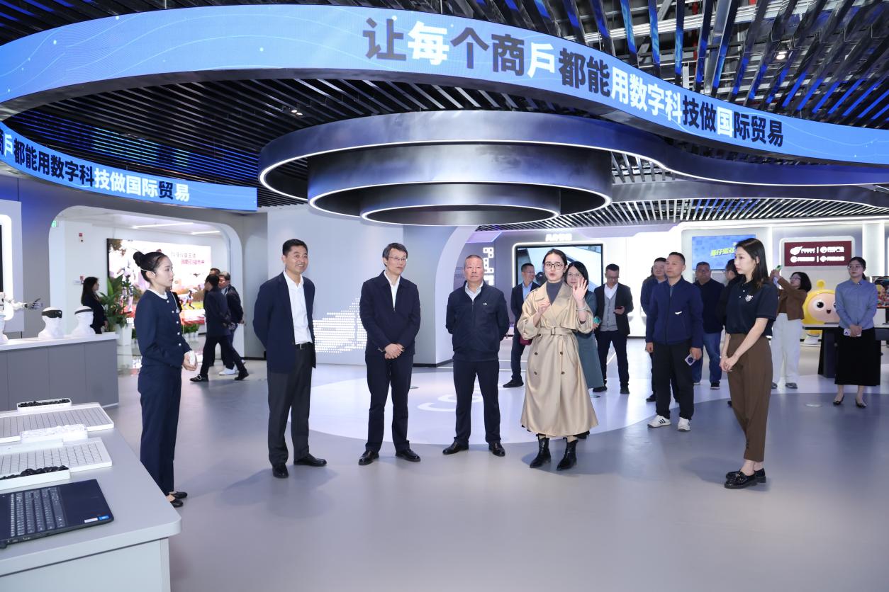 在全球数贸中心,自动生成多语名片、商铺智能导航、洽谈实时翻译、AI数字人广告等数字化场景层出不穷,生动展现了数字技术对传统贸易的赋能效应,为我校考察团队提供了一场关于新质生产力的直观、前沿的实践教学课堂。校领导一行与市场商户、企业代表亲切交流,沉浸式体验了一系列创新科技产品,重点询问了商户在电子商务平台运营与创意设计实践中的技术应用情况,深入了解了当前行业需求与市场格局的演变趋势,并由此延伸探讨了人才培养方向与教育教学改革路径。