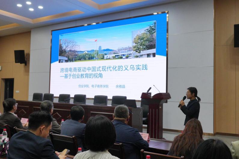 创业学院余雅晶老师以《跨境电商驱动中国式现代化的义乌实践》为主题,系统梳理了义乌作为国家级跨境电商试验区,通过跨境电商驱动中国式现代化县域样本的独特价值;展示了我校创业教育的创新体系和全方位双创教育生态,分享了丰富的学生创业案例,凸显了学校“面向人人、专创融合”的育人成效。