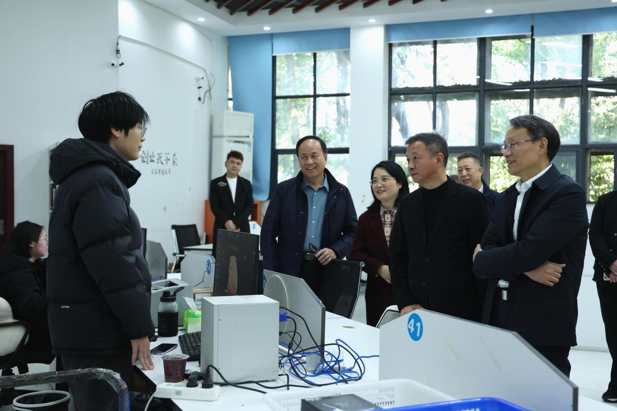 会前,盛勇军一行实地走访了电商直播间、青创空间、创业工作室等多个功能区域,与多名创业学子亲切交谈。在走访过程中,盛勇军详细询问了学生创业项目的运营模式、营收状况及供应链支持等情况,对学生们展现出的实战能力和市场敏锐度给予高度评价。