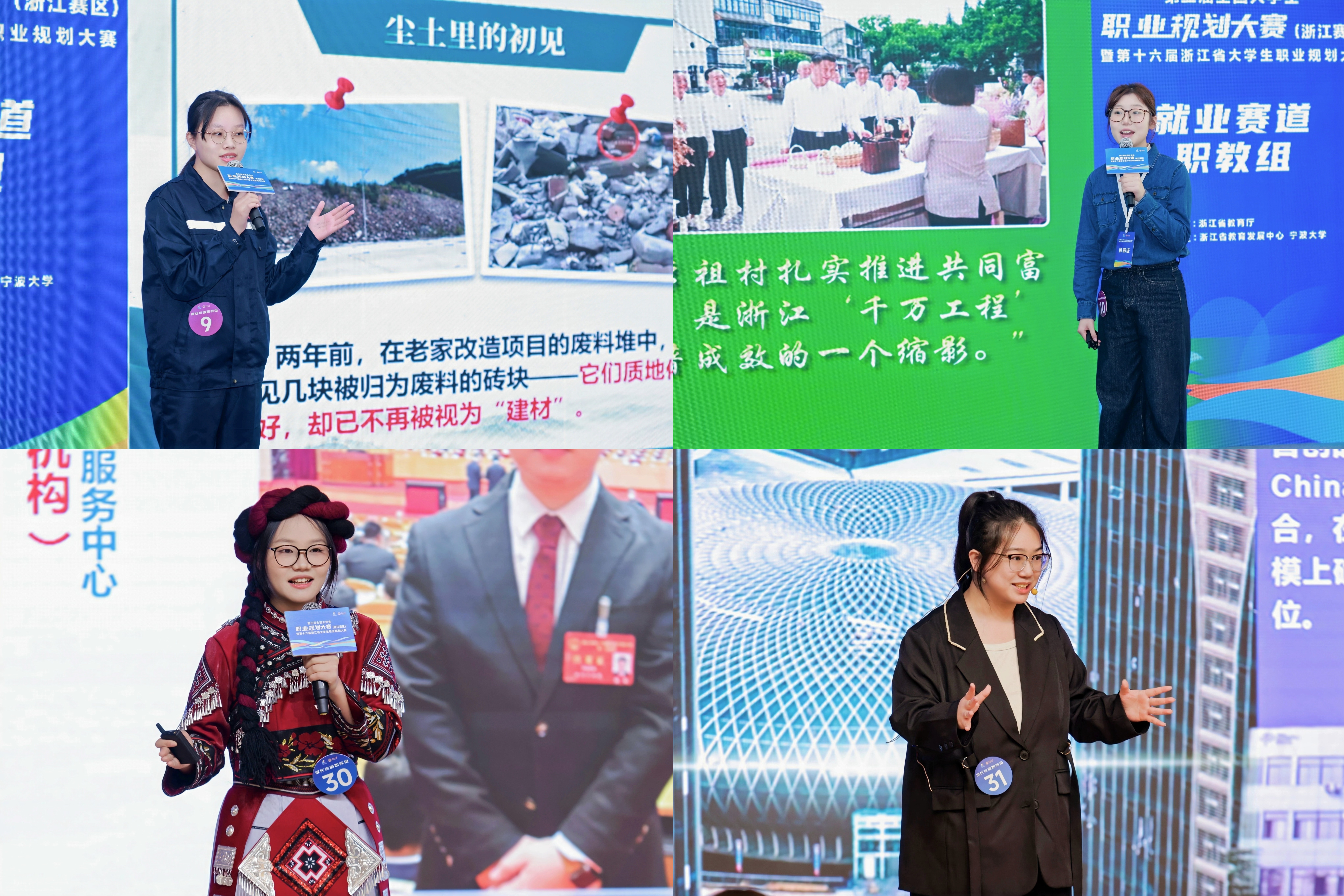 决赛现场,我校学子沉着应战,凭借精准的自我定位、科学的职业路径设计和出色的现场表现赢得评委一致好评。最终,创意设计学院曲茜睿、人文旅游学院王齐齐获职教组成长赛道金奖;经济管理学院施成杨、建筑工程学院丁梦霞获职教组就业赛道金奖。