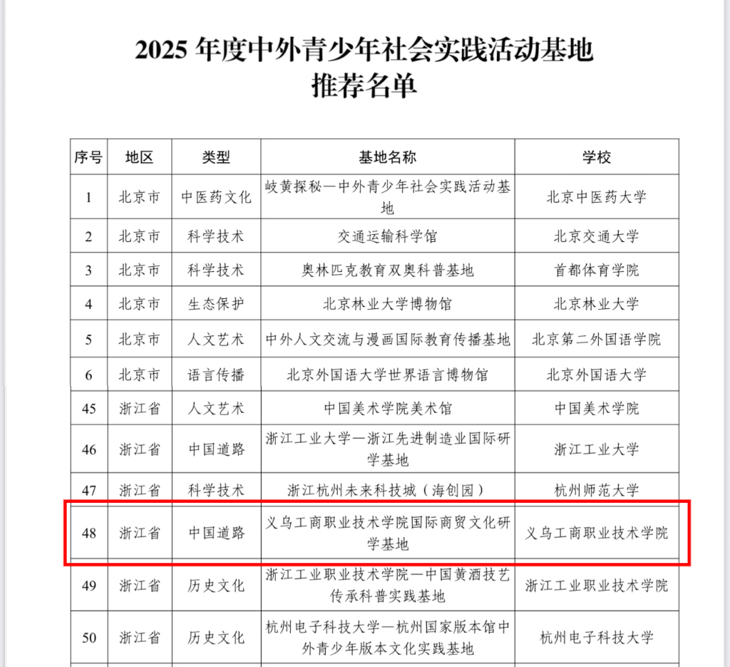2025年度中国教育国际交流协会“中外青少年社会实践活动基地”名单近日公布,学校申报的“国际商贸文化研学基地”成功入选,标志着学校在国际化实践育人平台建设方面取得了国家级认可。